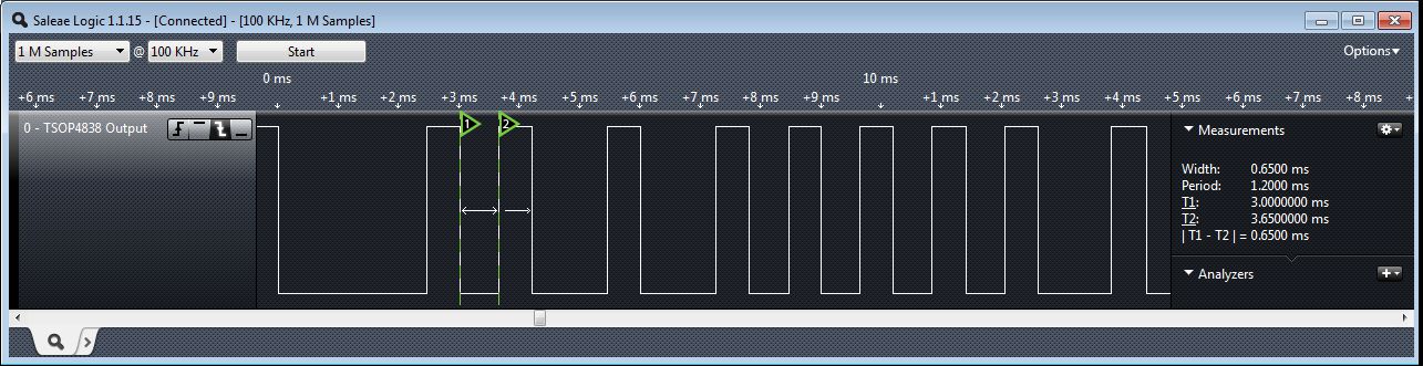 The section below shows the output from TSOP2238 IR PCM Receiver captured using a Salea Logic probe.