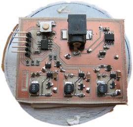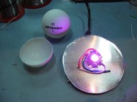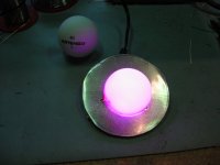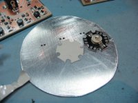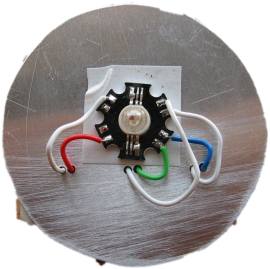 The pad size for the three inductors is SM2512. There are such a variety of inductors that could be used here with so many different footprints. I've left some clear area around the pads to facilitate the use of various inductors but you should make sure that the ones you do use aren't going to touch other areas of copper. This may require some creative positioning of the inductors. The RGB LEDs connect with the anode to the inductor and the cathode to the track that disappears under the ZXLD1350's. This should be apparent from the schematic but I'll mention it anyway. The 5 pin ICSP header needs soldering on the component side of the PCB and the middle pin also needs soldering on the copper side. It can be fitted to either side of the board depending on how you are going to mount the PCB, but you must make sure you solder it so it connects all the PCB tracks. This probably makes more sense if you look at the PCB. The push button switch can be mounted on either side of the PCB to suit your specific application. The surface mount DC power socket is a Switchcraft RASM722 2.1mm SMT Power Socket. (Rapid Electronics P/N 20-0896) 0.33 ohm SMD resistors and ZXLD1350 can be sourced from Farnell The 3 Watt RGB LED can be difficult to source, Rapid Electronics did have one, Farnell only do the Lamina Atlas which isn't suitable for this project. The only other source seems to be buying from sellers in Hong Kong or China through E-Bay. I've done this and even with postage it can be cheaper than UK suppliers, although it can take 10-14 days to arrive. I've used this company http://stores.ebay.co.uk/Sure-Electronics The LED is fixed to the aluminium disc using Adhesive Thermal Pads. In the UK you can get this from Rapid Electronics and Farnell.In the photographs below, the PCB is fixed to the aluminium disc using thick (foam backed) double sided tape. The tape is doubled up to give some clearance between the disc and underside of the PCB and a thin sheet of plastic (from take-away food container) is used to provide insulation between the two. The depth of the recess in the base of the lamp requires that you make the whole assembly as shallow as possible, otherwise the body of the DC power connecter will be below the bottom of the lamp base. Keep this in mind when assembling it. A ping pong ball, cut in two makes a good light diffuser. I've also used opaque tops from aerosol tins to good effect. Although this specific application makes use of a single package RGB LED, it is equally suited to driving separate red, green and blue LEDs. It can also drive 3 pairs of series connected LEDs. However, it cannot be used with RGB LEDs that have a common anode or cathode. Worth checking out are the Lamina Atlas RGB LEDs which