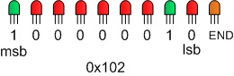as MSB to LSB, Red =0, Green = 1, Orange =end